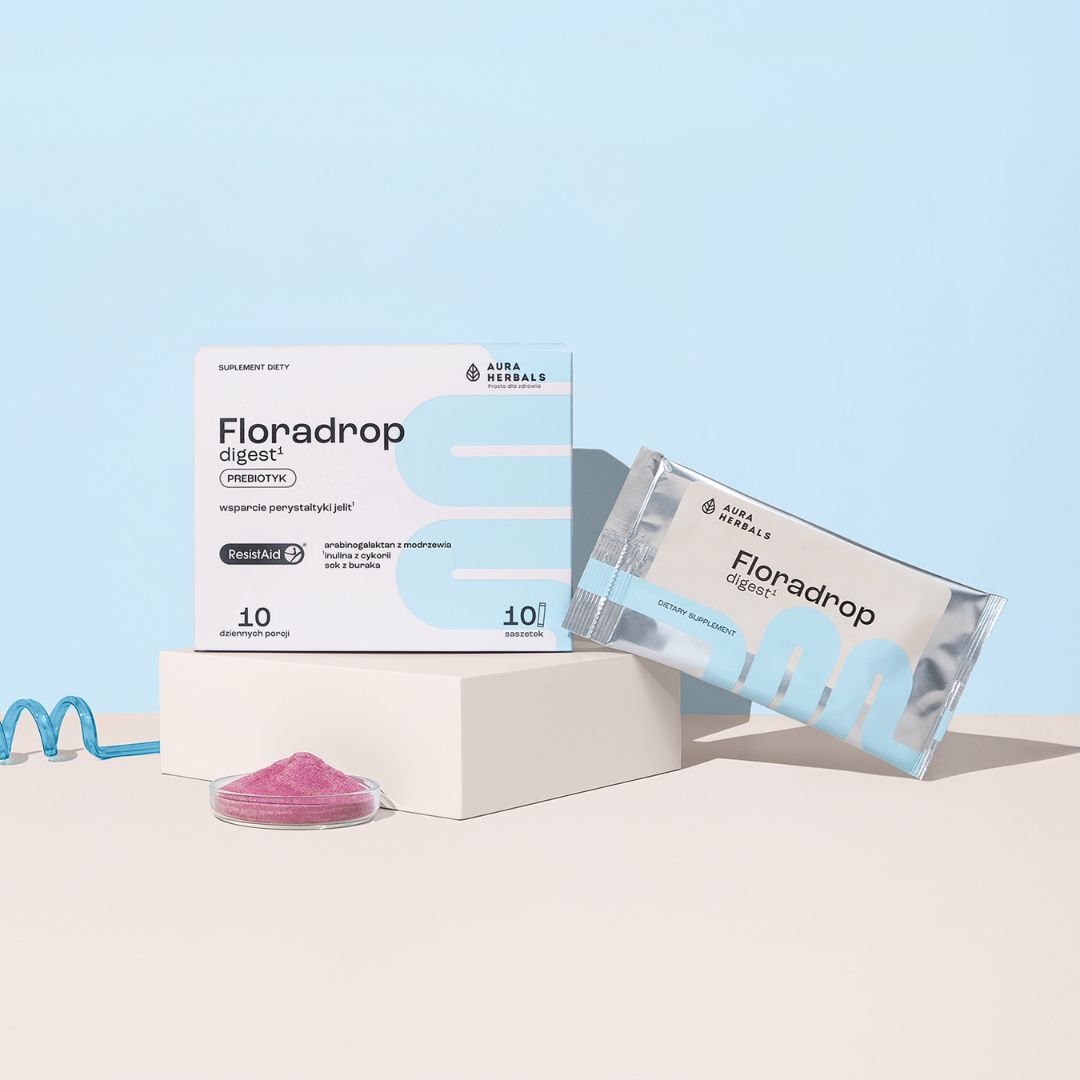 Floradrop digest¹, prebioottinen pussi, joka sisältää patentoitua amerikkalaisen lehtikuusipuun (Larix laricina) uutetta, joka on standardoitu 85-prosenttisesti arabinogalaktaaniksi (ResistAid®).